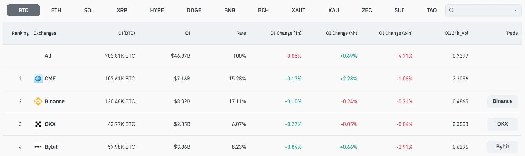 Analytics from CoinGlass revealed that aggregate BTC futures open interest contracted 2.5%, falling to $46.49 billion within merely four hours following Trump’s remarks. CME’s open interest decreased 2.70%, while Binance recorded a 2.96% reduction. Such movements generally indicate traders liquidating bullish positions.