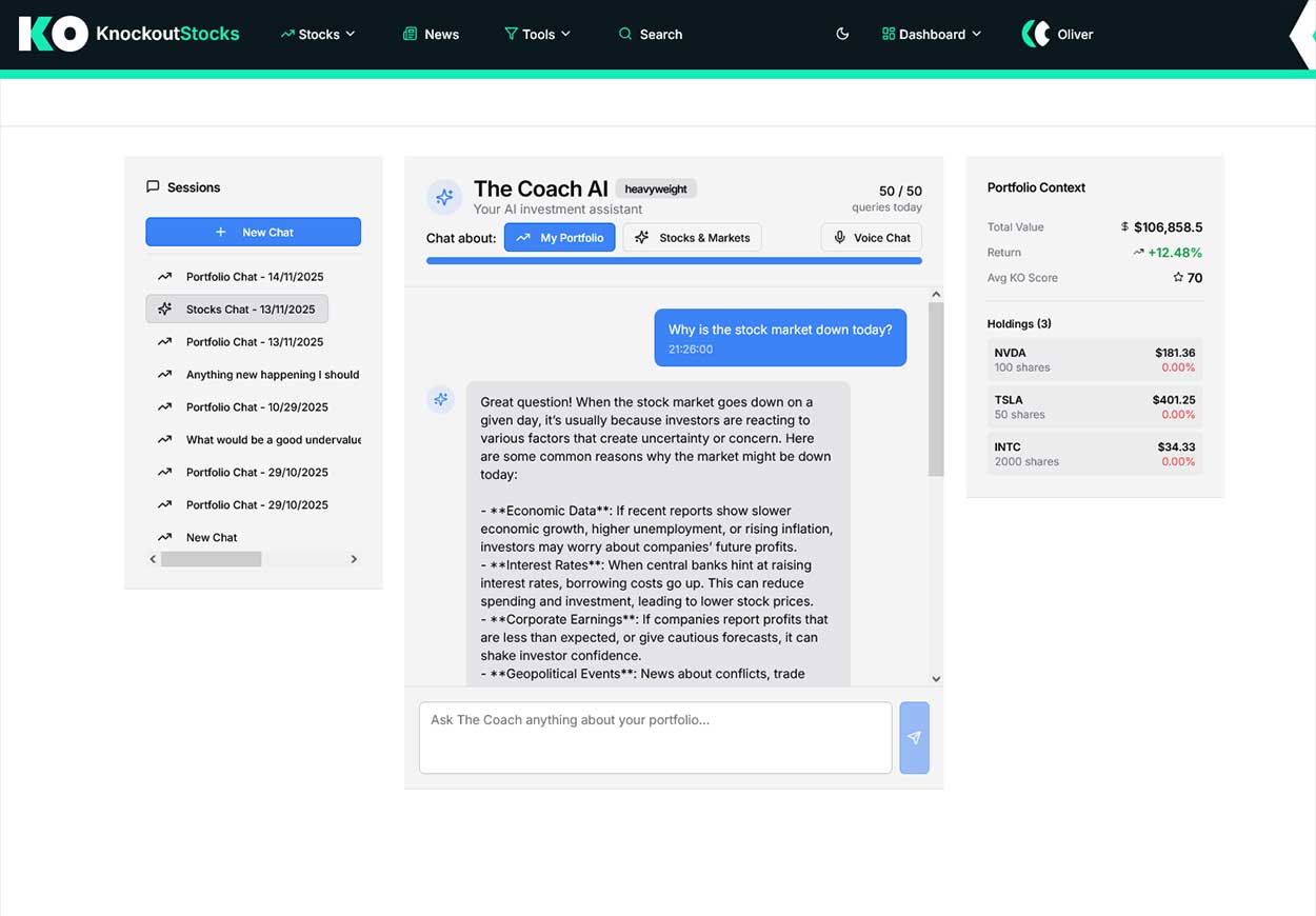 KnockoutStocks features a comprehensive portfolio tracker with real-time performance information, profit and loss monitoring, and AI-enhanced portfolio examination. The Heavyweight plan accommodates up to 100 stocks per portfolio with unlimited portfolio creation and AI-generated portfolio analytics.