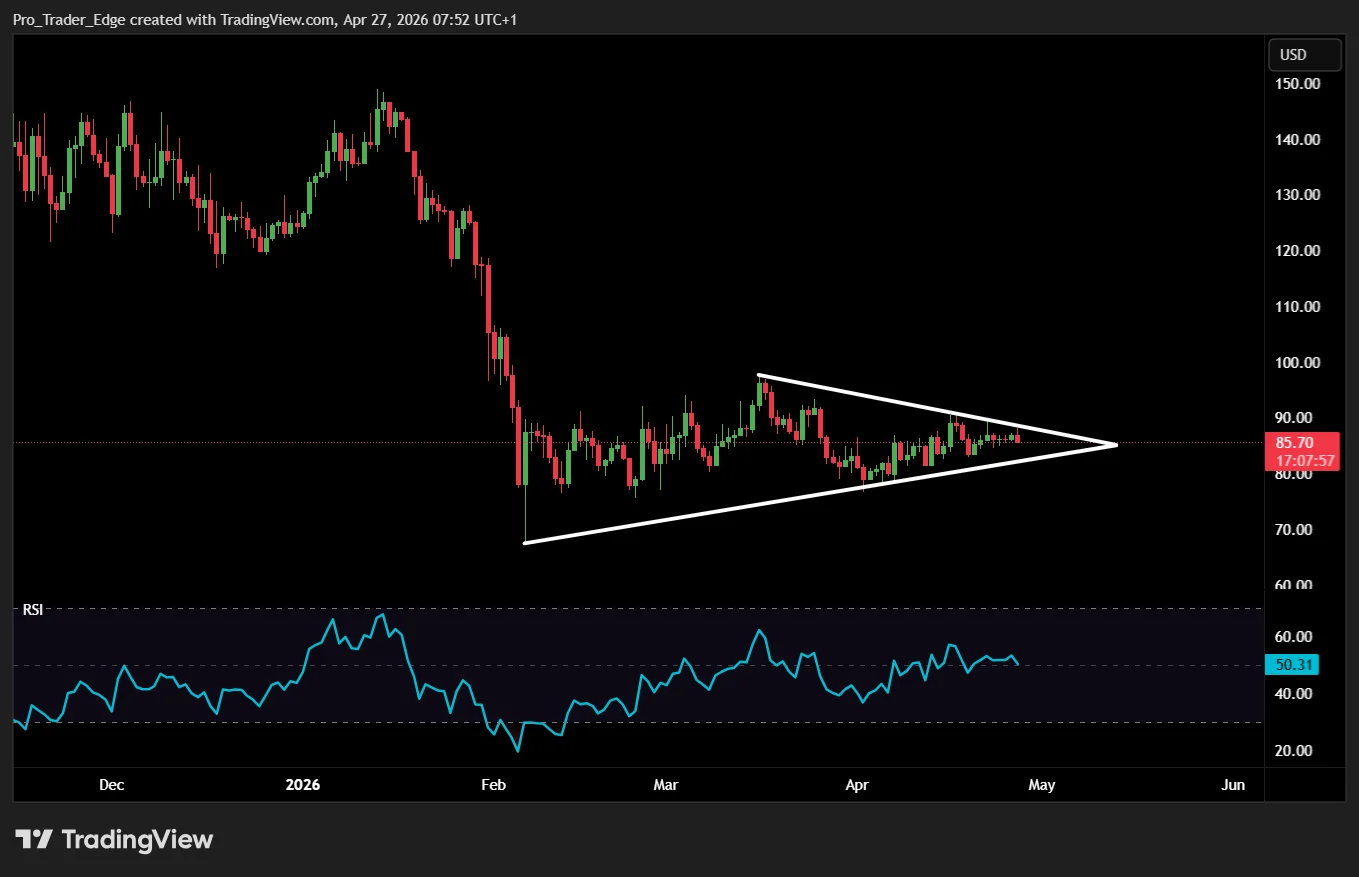 SOL is testing the upper boundary of a symmetrical triangle formation near $89.00 on the daily timeframe. A confirmed break above this technical structure would bring the psychologically significant $100 level into view, followed by the 200-day EMA positioned at $113.