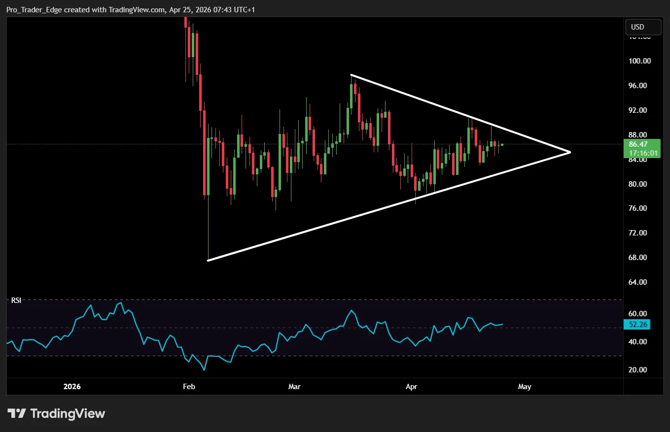 Examining the daily chart reveals SOL has constructed a symmetrical triangle configuration. The critical breakout threshold is positioned at $90. Should price action achieve a close above this level, the projected technical target derived from this pattern reaches approximately $130, representing roughly 50% upside from current valuation.