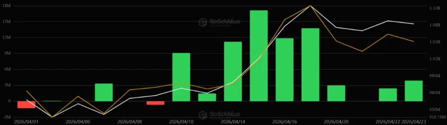 Spot XRP ETFs registered net inflows totaling $3.89 million on Thursday, pushing aggregate inflows to $1.28 billion since inception. Combined assets under management across all XRP-focused ETFs have climbed to $1.08 billion, according to tracking platform SoSoValue.